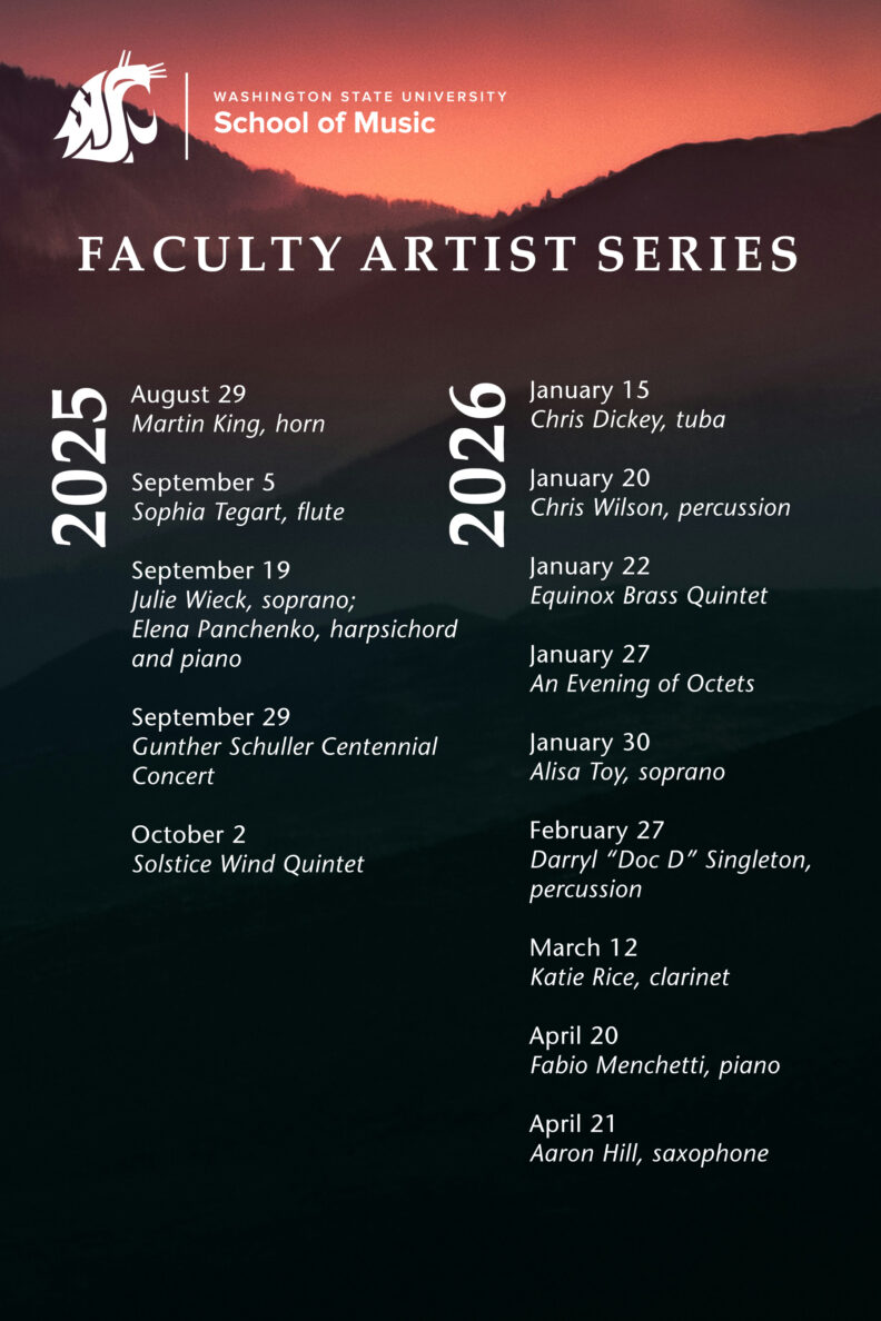 Every year the School of Music Faculty present recitals for our students and the community. While in the past we have charged admission to raise money for student scholarships, we want to make music and cultural events easier to attend for the people in our community. In an attempt to give back to the supportive community here in Pullman, we have opted for free admission to our the Faculty Artist Series concerts, effective Fall 2021! Most other concerts have always been free admission and that will not change, but we are now adding the Faculty Artist Series to the list of free concerts. We hope this makes access to the concerts easier for everyone, but that those who can provide support for the students in the School of Music will continue to do so through donations at the door. Those donations will go directly to the student scholarships fund and help support the students you will be seeing in the audience and on stage all year long!