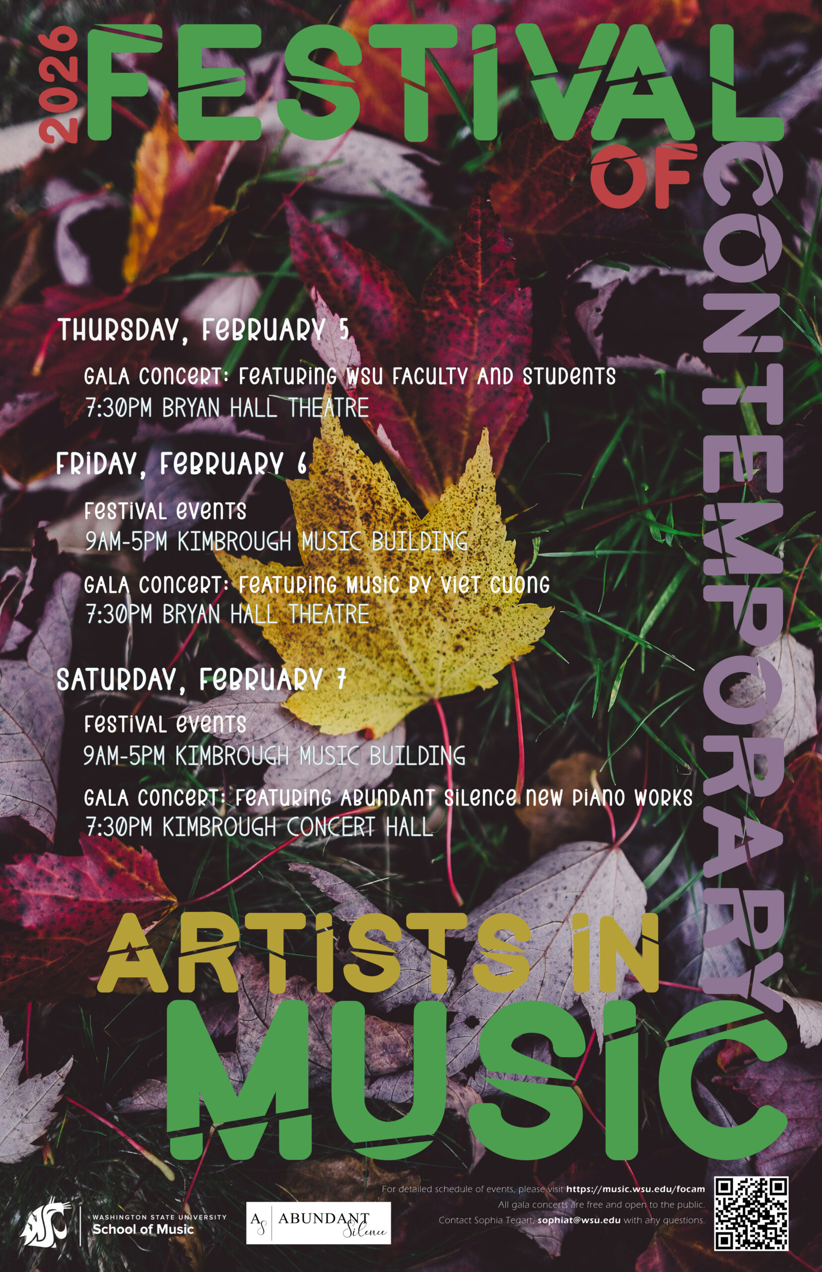 The Festival of Contemporary Artists in Music celebrates the music of our time. The festival highlights the work of WSU student and faculty composers and performers alongside visiting composers, performers, and scholars. This festival is a chance to celebrate the diversity found in today’s music and its people. It is designed to allow everyone’s voice to shine.